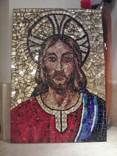 mosaico indiretto realizzato con marmi per il volto, smalti veneziani per le vesti e oro per lo sfondo.